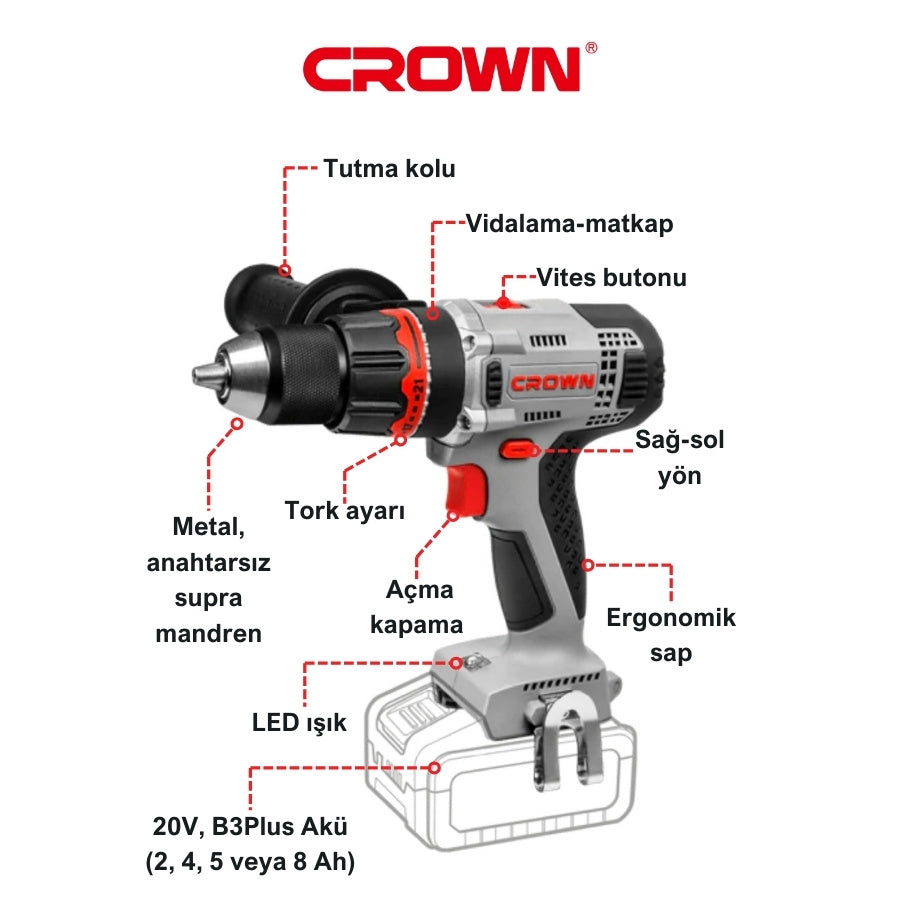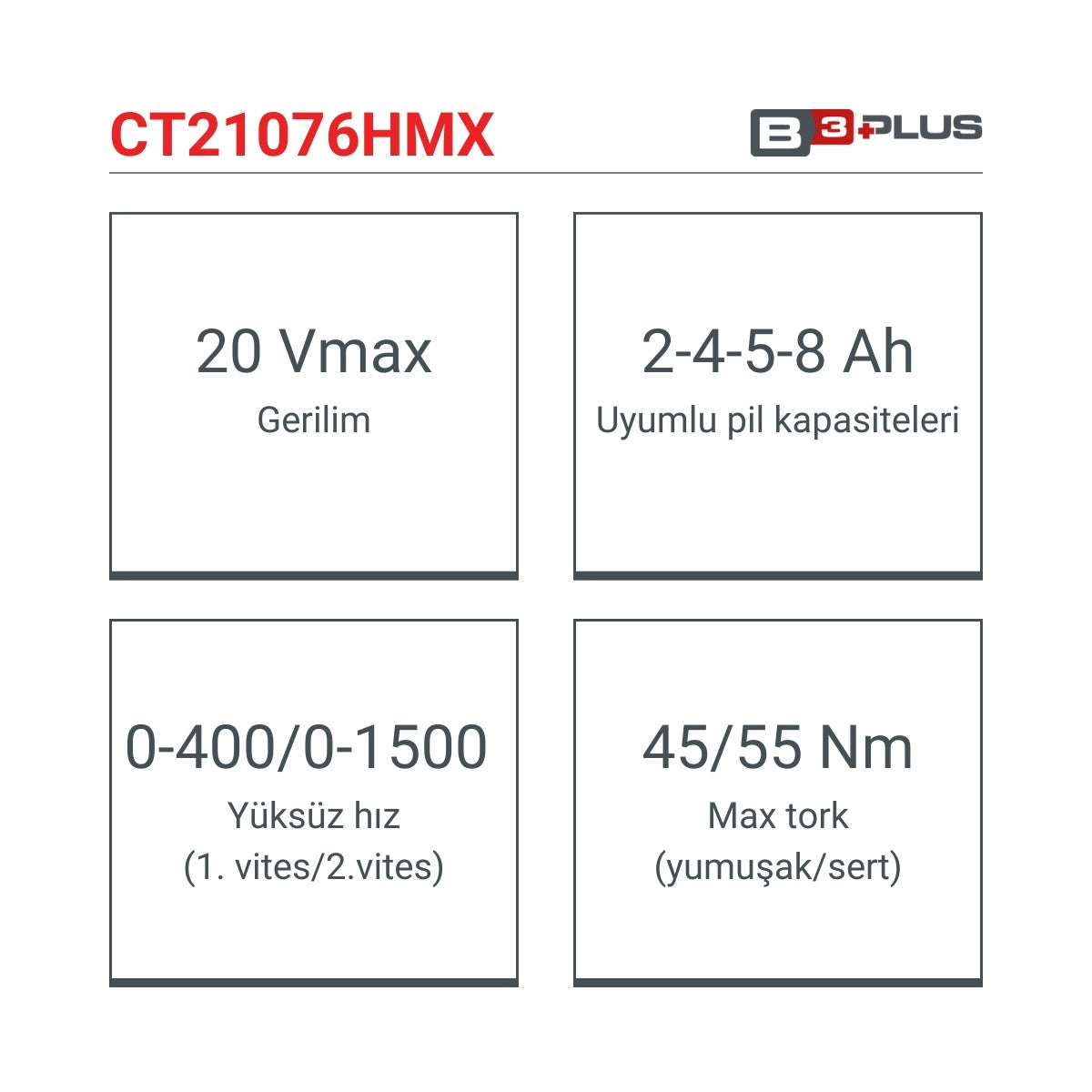 Hem vidalama hem de matkap özelliği ile CT21076HMX’i tercih etmek için sayısız nedeniniz var. Yüksek devir, güçlü şanzıman, elektronik hız kontrolü, kompakt ve ergonomik yapısı bunlardan sadece birkaçı. Değişken torku ve çift vites özelliği sayesinde istediğiniz hızda çalışabilirsiniz. LED aydınlatması ile karanlık ve loş ortamlarda kolayca çalışabilir, bataryadaki şarj göstergesi ile akü seviyesini rahatlıkla takip edebilirsiniz. Otomatik metal mandreni ile uç söküp takmak çok kolay, üstelik ilave bir anahtara da ihtiyacınız yok. Ayrıca bu üründe kullanabileceğiniz 2 Ah kapasiteli CAB202013XE, 4 Ah kapasiteli CAB204014XE, 5 Ah kapasiteli CAB205014XE ve 8 Ah kapasiteli CAB208016XE model aküler ile tüm 20V Crown B3 Plus ailesi ürünlerini kullanabilirsiniz.